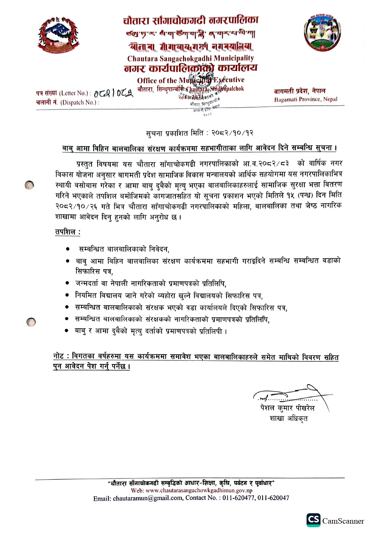 बाबुआमा विहिन बालबालिका संरक्षण कार्यक्रममा सहभागीताका लागि आवेदन दिने सम्बन्धि सूचना ।