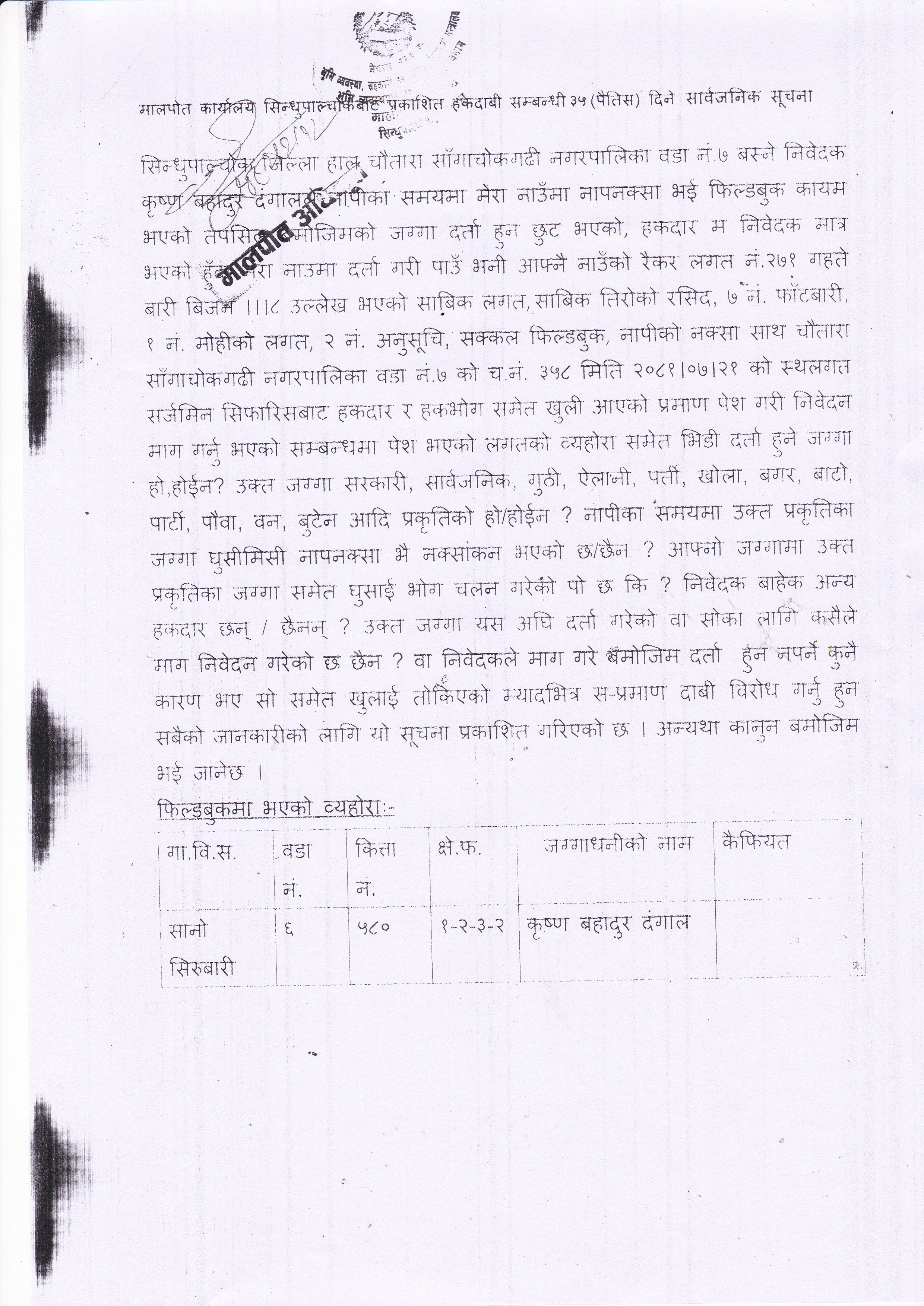 श्री मालपोत कार्यलय सिन्धुपाल्चोकबाट जारी भएको हकदाबी सम्बन्धी ३५ दिने सार्वजनिक सुचना